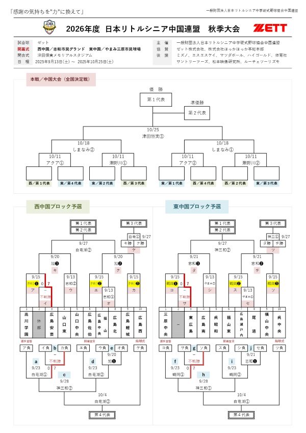 2026年度 日本リトルシニア中国連盟 秋季大会 組合せ決定